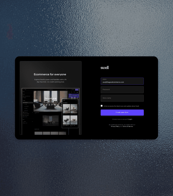 Create a free Swell account. Add your products, set up payments, configure your store settings.